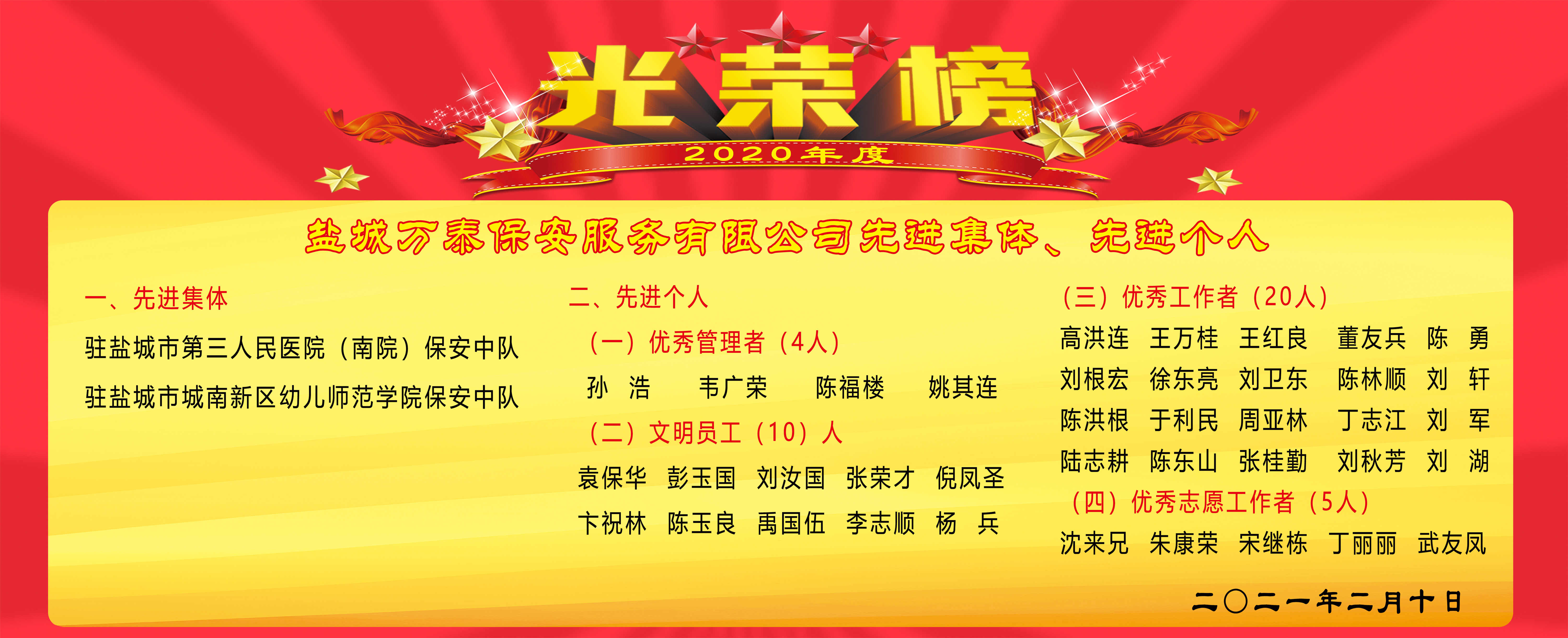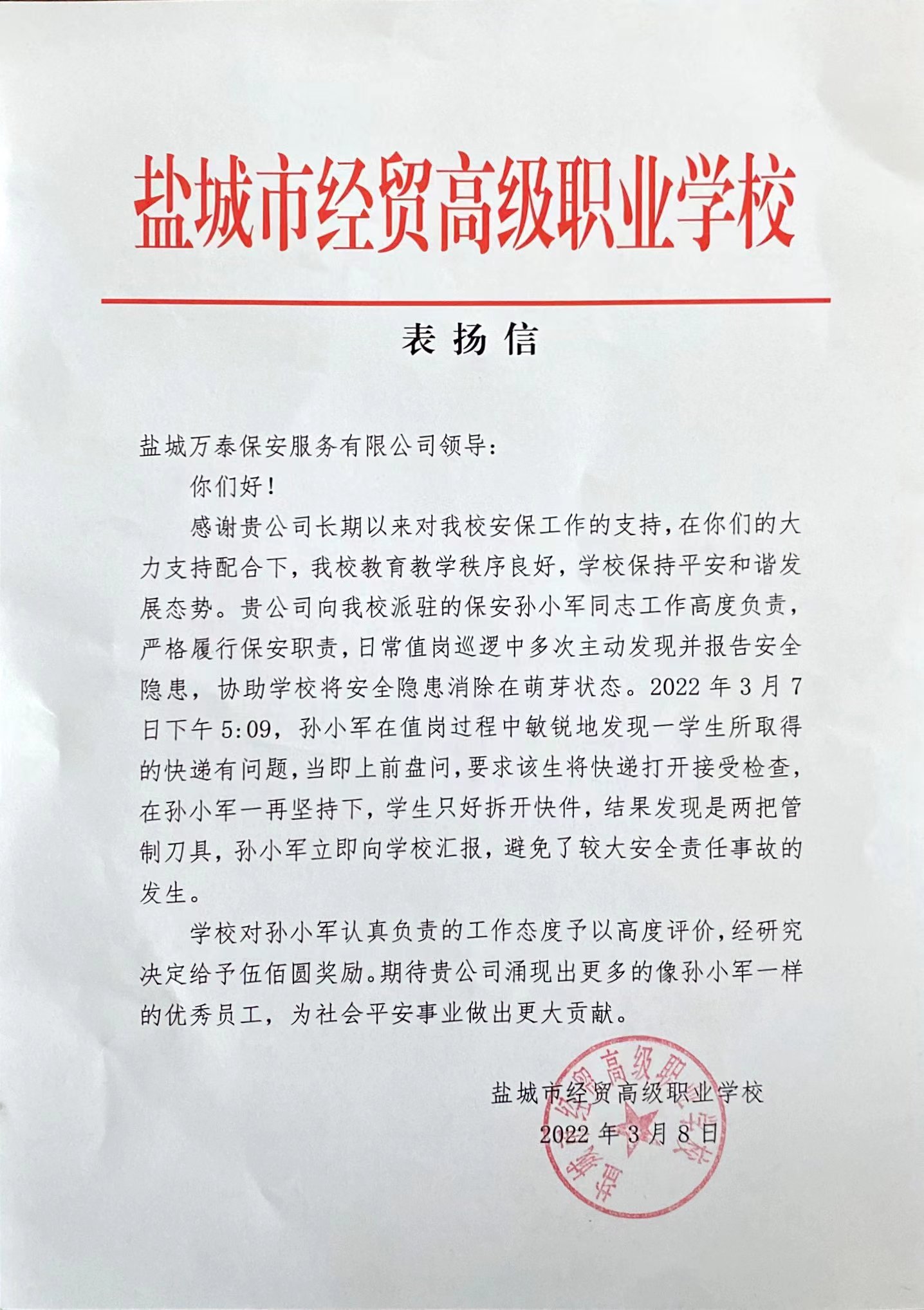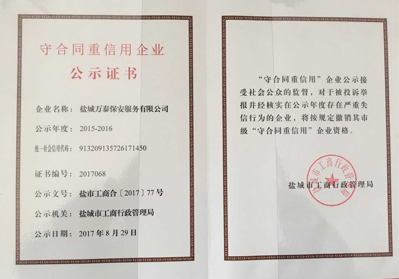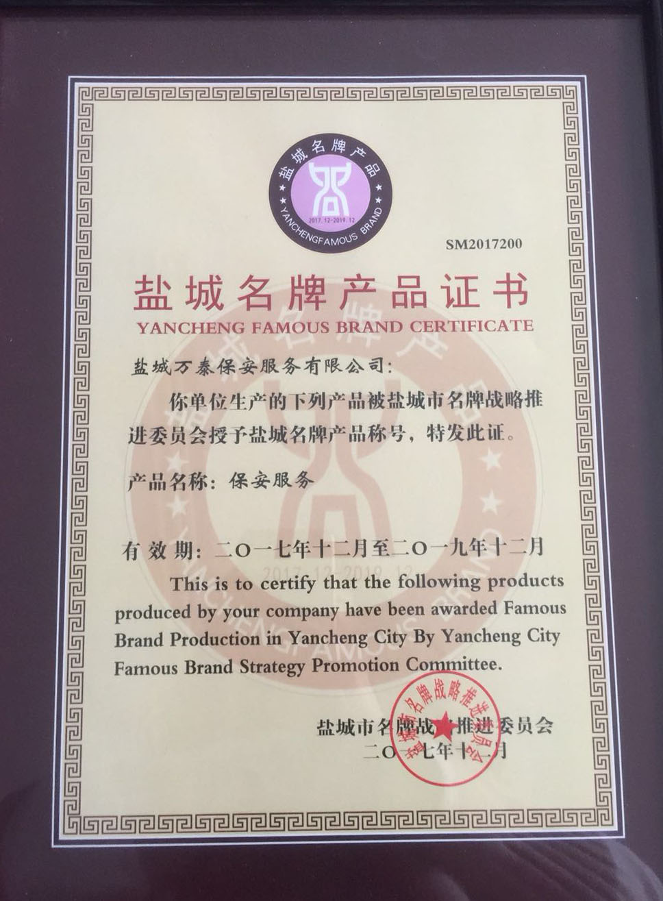 鹽城萬泰保安服務有限公司于2011年4月15日,由江蘇省公安廳、鹽城市公安局、工商局 、稅務局等部門批準成立。公司現擁有員工500多人,公司成立七年多來,接受公安機關的監督管理和業務指導,與公安部門建立了良好的支援合作關系。公司現設有董事長室,黨支部,工會,下設總經理室,保安部,業務部,人力資源部,督察部,裝備部,辦公室,財務科等部門。服務項目目前重點以人防業務為主。人防服務范圍主要以門衛、守護、巡邏、大型 活動護衛為主,主要服務于政府機關、工廠、企事業單位、金融、學校、醫院、公共娛 樂場所、商場超市等70多家單位。我公司通過社會化、市場化、專業化和規范化的保安服務,為各企事業單位提供創新、精致的管理,為客戶提供安全優質的服務,為客戶的人身及財 產安全保駕護航,讓客戶無憂。